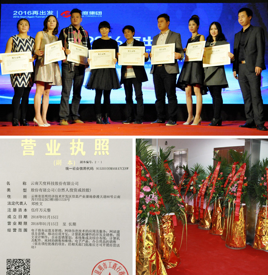 2016年1月28日,云南天度集團(tuán)董事長鄭桂文向所有獲得股份獎(jiǎng)勵(lì)的員工頒發(fā)了《股權(quán)證書》,并將所有股東、董事、監(jiān)事提交到云南省工商行政管理局進(jìn)行了正式登記。