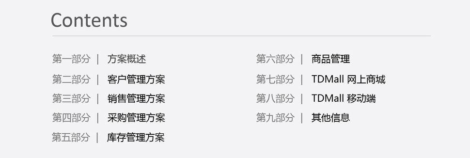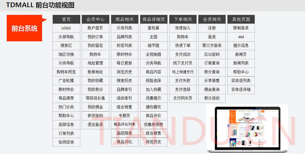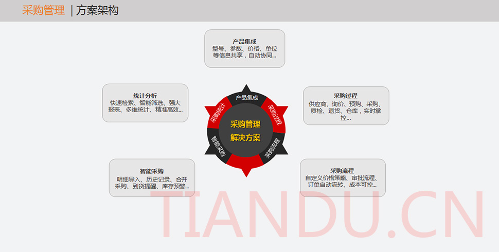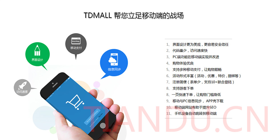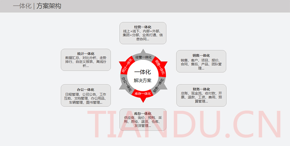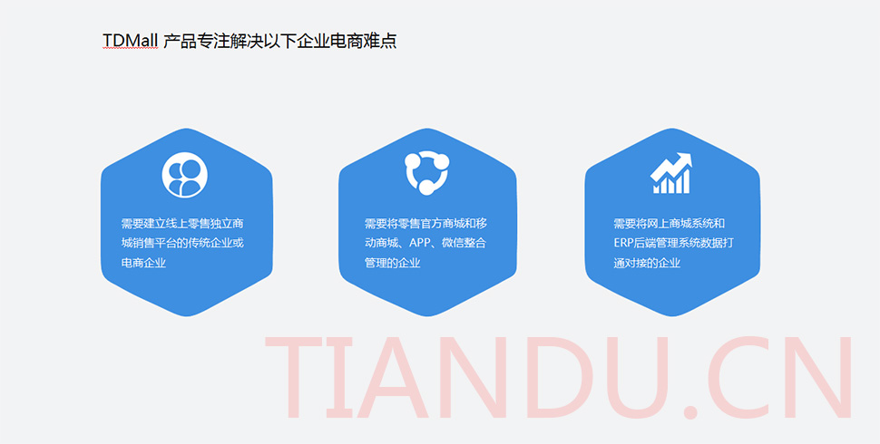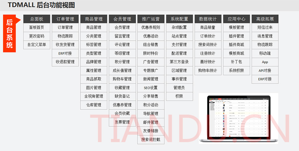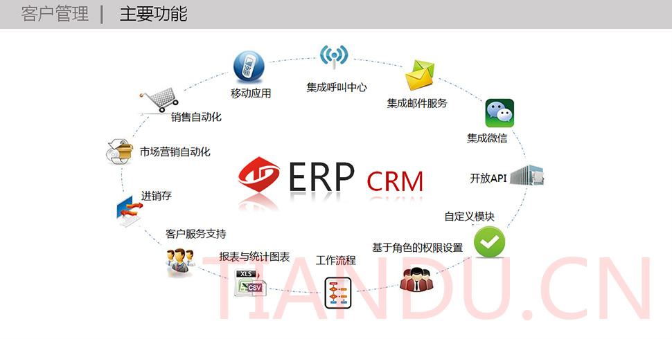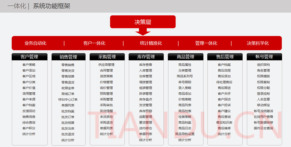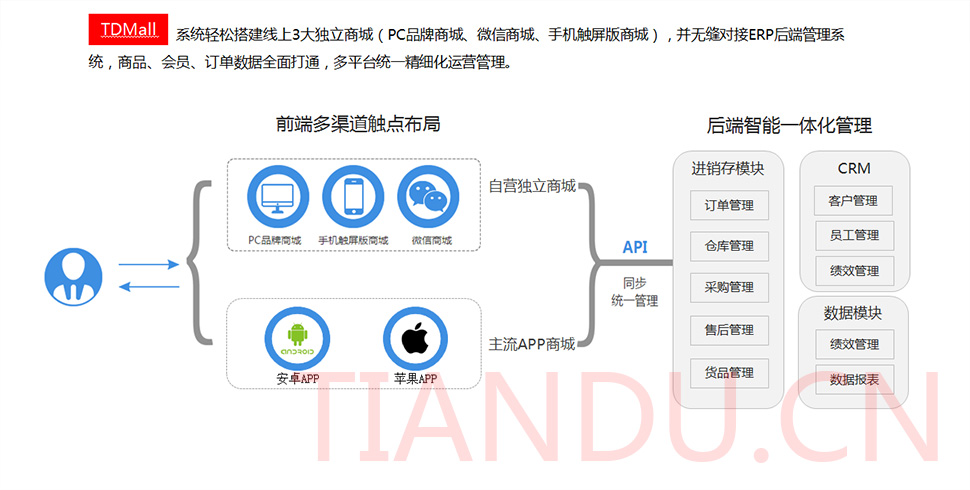 天度科技互聯(lián)研究院(博士后科研工作站)、天度軟件系統(tǒng)有限公司、天度科技股份有限公司合力近400人專業(yè)研發(fā)團(tuán)隊(duì),結(jié)合自身11年電子商務(wù)運(yùn)營(yíng)經(jīng)驗(yàn),全力打造TDMALL電商ERP系統(tǒng):整合電商網(wǎng)站平臺(tái)(PC版、觸屏版、微信版、APP版)、ERP企業(yè)資源管理系統(tǒng)、CRM客戶關(guān)系管理系統(tǒng)、財(cái)務(wù)管理系統(tǒng)、OA辦公系統(tǒng)和Call Center呼叫中心等系統(tǒng),實(shí)現(xiàn)前端電商平臺(tái)及后端強(qiáng)大支撐系統(tǒng)的管理。