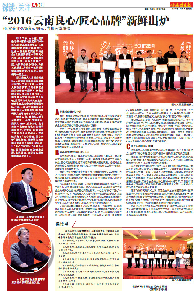 昨日下午,由云南信息報、滇商雜志、云南省民營企業(yè)家協(xié)會、云南省食品協(xié)會等6家機構(gòu)發(fā)起的“2016良心/匠心品牌揭曉儀式”在翠湖賓館多功能廳隆重舉行。這是一場名副其實的年終盛會:云南經(jīng)濟領(lǐng)域一群用良心興業(yè)、匠心筑業(yè)的云南品牌和有共識的云南商人聚集在一起,共同弘揚良心/匠心,力挺云南質(zhì)造,為社會奉獻物質(zhì)財富和精神財富,為實現(xiàn)云南夢竭盡一己之力。