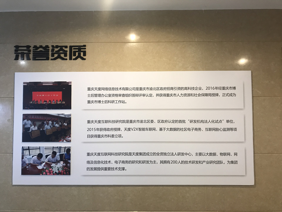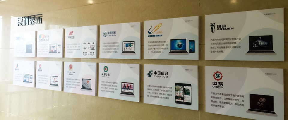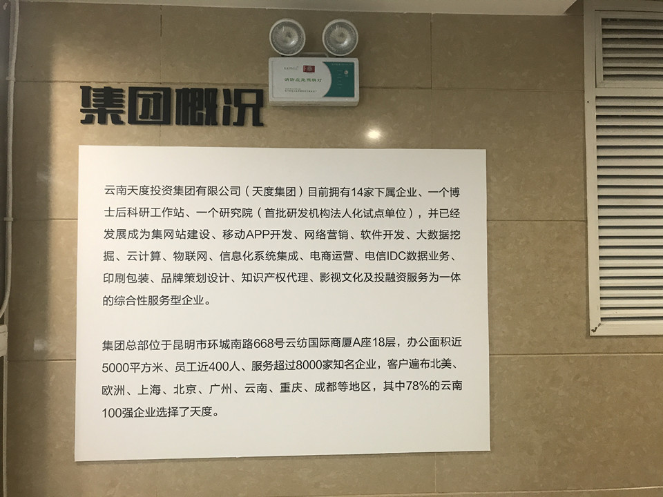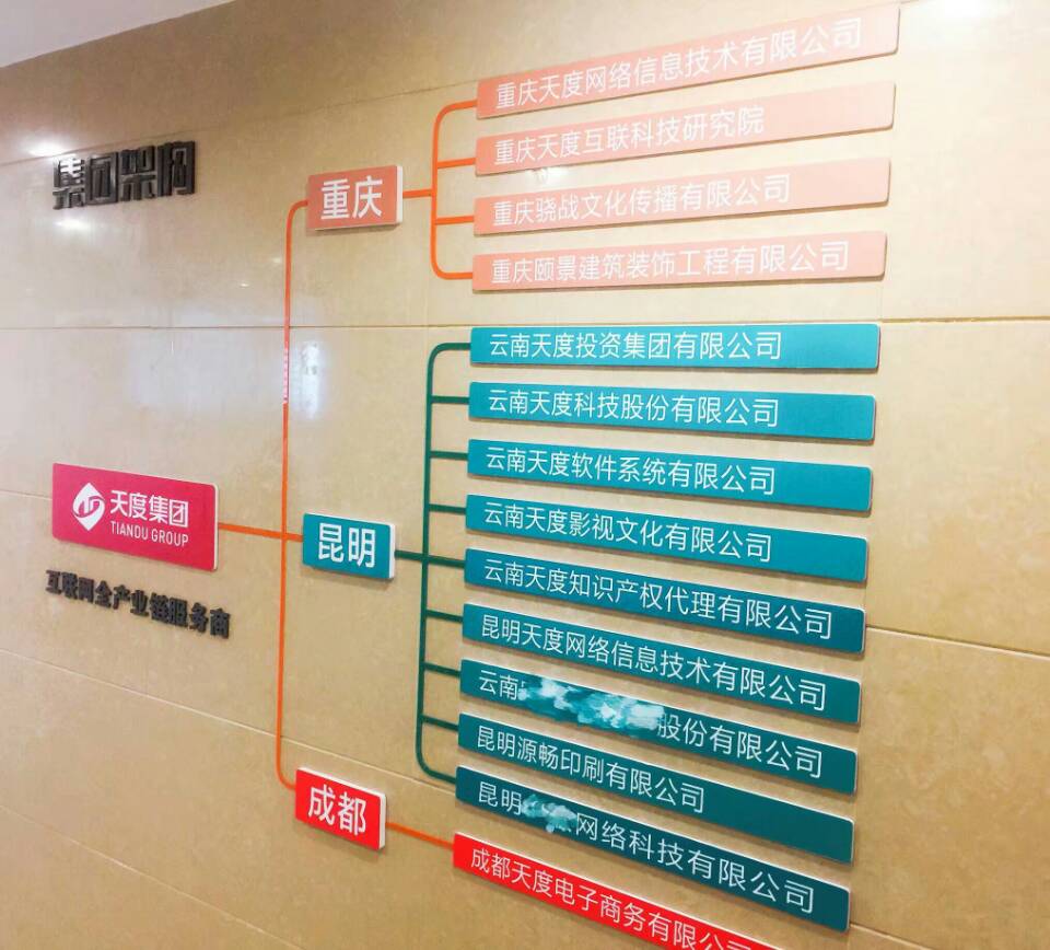 集團(tuán)概況的文化墻對(duì)面就是咱們天度更詳細(xì)的“集團(tuán)架構(gòu)”,分別羅列出了重慶、昆明、成都三個(gè)總部的子公司,讓客戶對(duì)天度集團(tuán)名下的子公司有更深入的認(rèn)識(shí),也從正面證明了天度12年積累下來(lái)的傲人的成果。