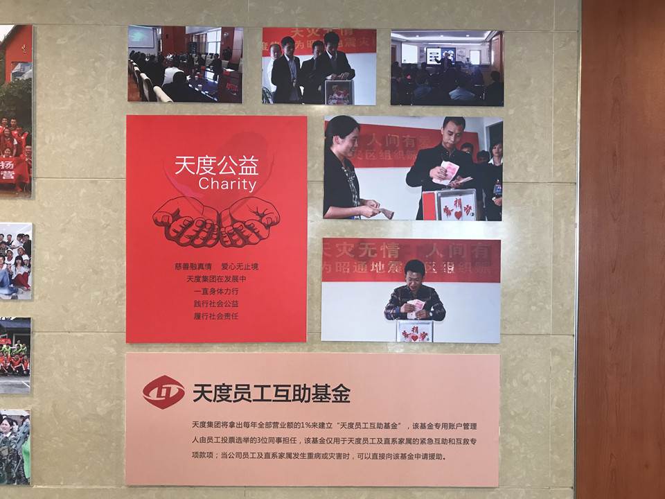 每一分榮譽(yù)證書(shū)的背后,都離不開(kāi)為集團(tuán)默默付出的員工。天度集團(tuán)也珍視每一位員工,特別在集團(tuán)內(nèi)部設(shè)立“天度公益”,一個(gè)只屬于天度員工的互助基金,賬戶管理由全體員工投票選出三位同事?lián)危?dāng)公司員工及家屬發(fā)生重病或?yàn)?zāi)害時(shí),可以直接向該基金申請(qǐng)救助!