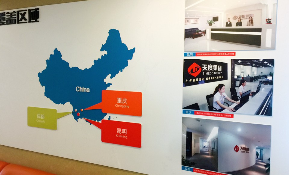 再往里走就到了“覆蓋區(qū)域”文化墻,主要內(nèi)容是展示重慶、昆明、成都三個(gè)總部地址。