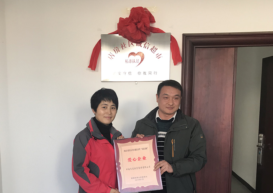 西山區(qū)科技局局長王敬紅、烏龍鎮(zhèn)鎮(zhèn)長楊勇、人大主席肖嬋姬、西山區(qū)扶貧辦領(lǐng)導(dǎo)等出席了捐贈(zèng)儀式。店房村黨支部馬書記、店房村委會(huì)馬主任與楊總、宮副總一同對(duì)愛心超市進(jìn)行揭牌。