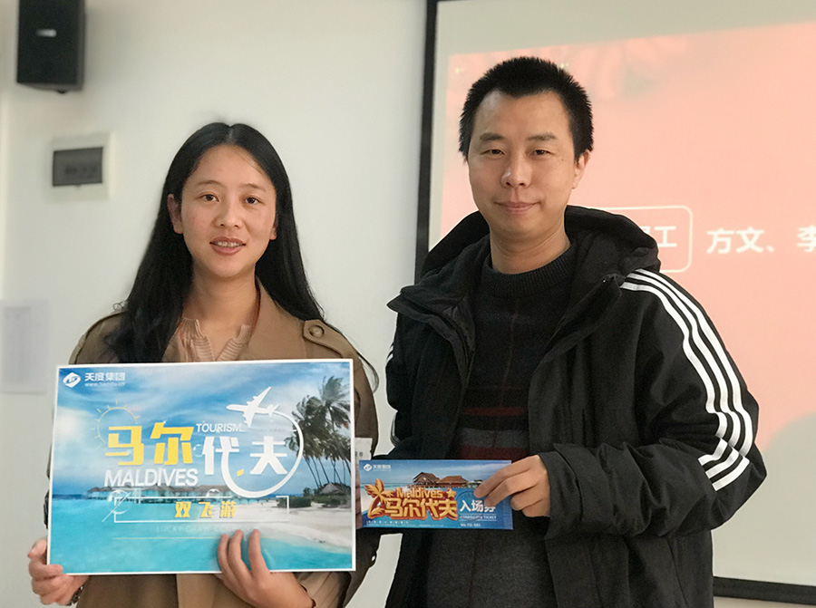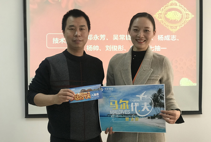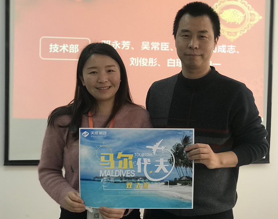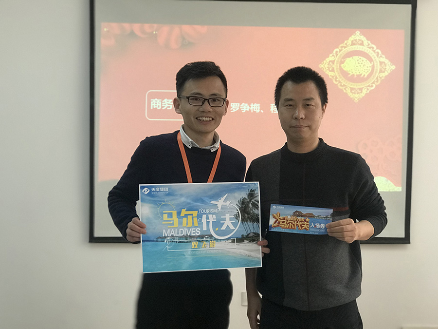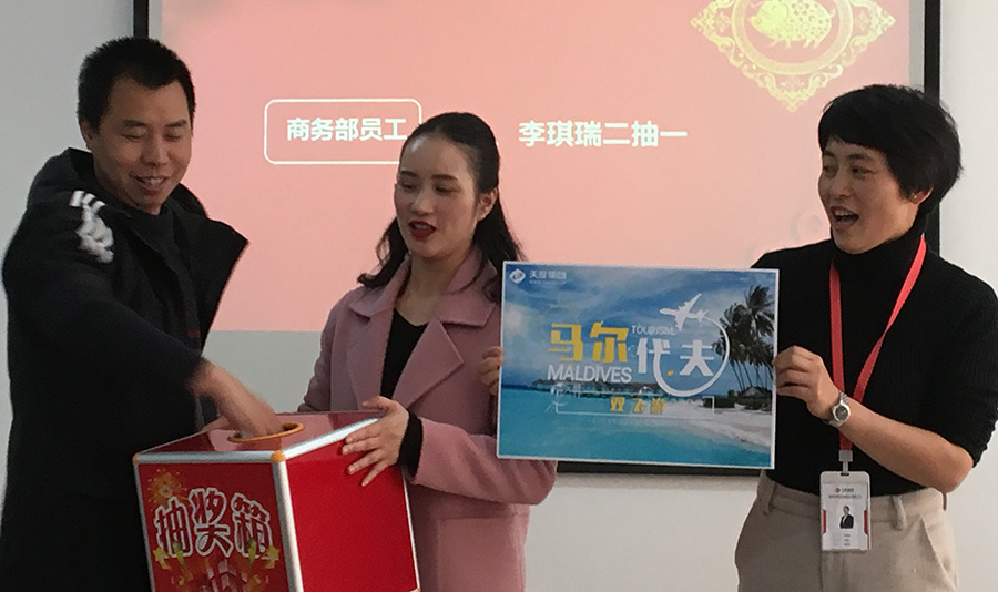 天度網(wǎng)絡(luò)公司今年拿出數(shù)十萬現(xiàn)金紅包,由楊總和陸總進(jìn)行發(fā)放(集團(tuán)每個(gè)公司的獎(jiǎng)勵(lì)和獎(jiǎng)金發(fā)放都是單獨(dú)進(jìn)行,據(jù)悉,集團(tuán)今年不管是獎(jiǎng)金總額、還是獎(jiǎng)金單額都超過往年,總額超過7位數(shù))。公司對2018年度各部門優(yōu)秀同事進(jìn)行了表彰,并發(fā)對各個(gè)獎(jiǎng)項(xiàng)進(jìn)行發(fā)放,同時(shí)鄭董事長現(xiàn)場抽取了“馬爾代夫帶薪休假旅游”的名額。