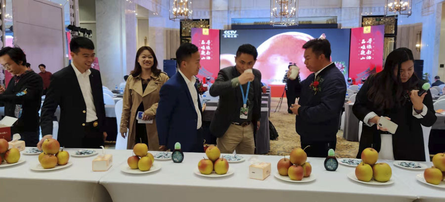 ▲施錦明向盒馬鮮生總部采購專家介紹巍山紅雪梨