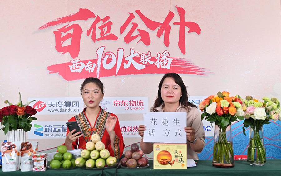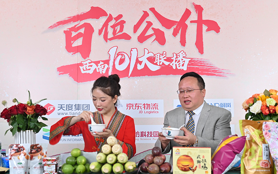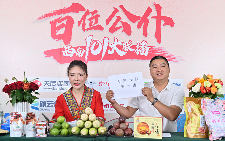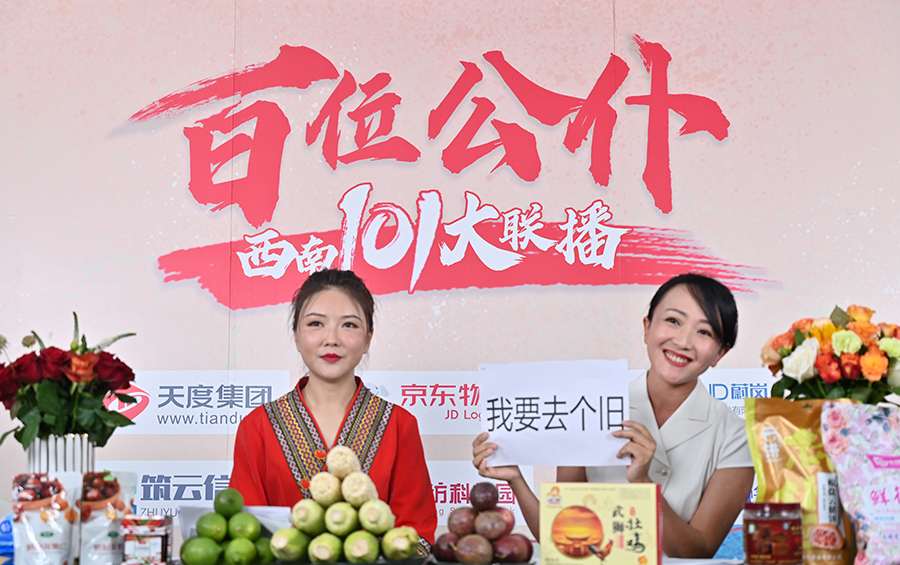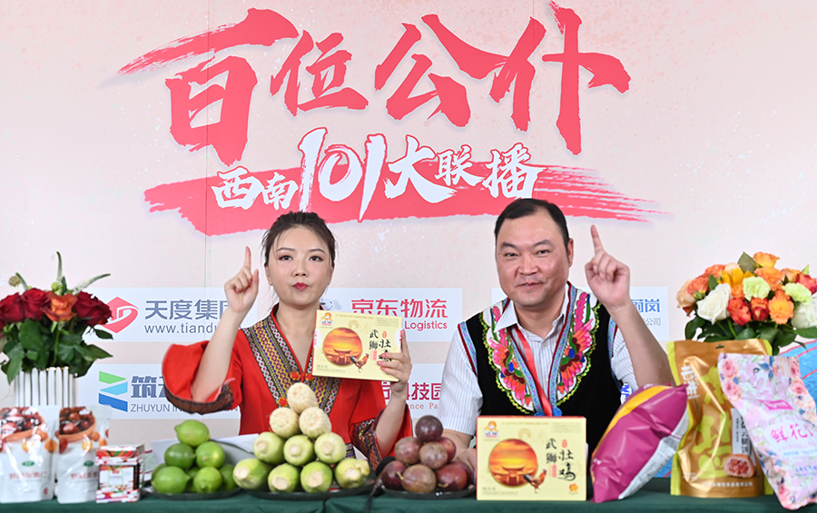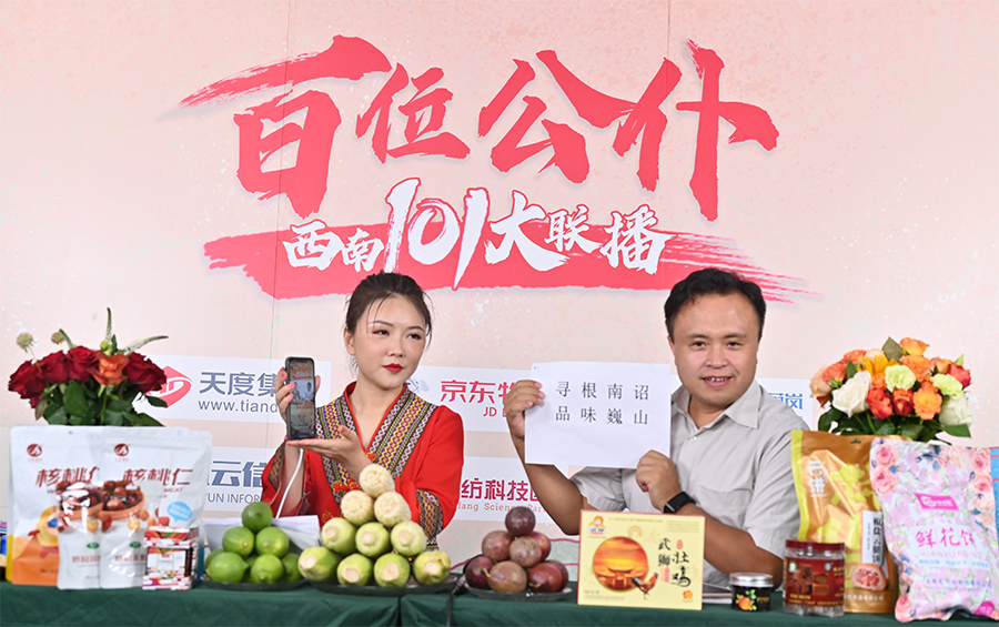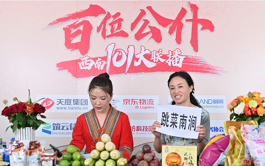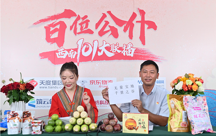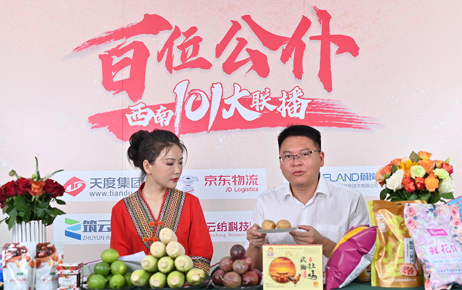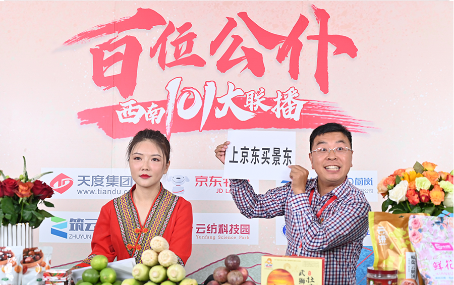 6月17日下午,“百位公仆,西南101大聯(lián)播”大型助農(nóng)直播活動在云紡科技園直播基地舉行,來自云南巍山、南澗、水富、個舊、開遠、彝良、武定、景東、景谷等縣(市)的11位副縣(市)長,與四川知名電視主持人、直播記者郭秀一同走進直播間,同框出鏡,為云南各地好貨代言,推動農(nóng)產(chǎn)品推廣上行,助力脫貧攻堅。近3小時的直播中,特色的農(nóng)產(chǎn)品、實惠的價格,以及豐厚的贈品吸引了260多萬網(wǎng)友圍觀。