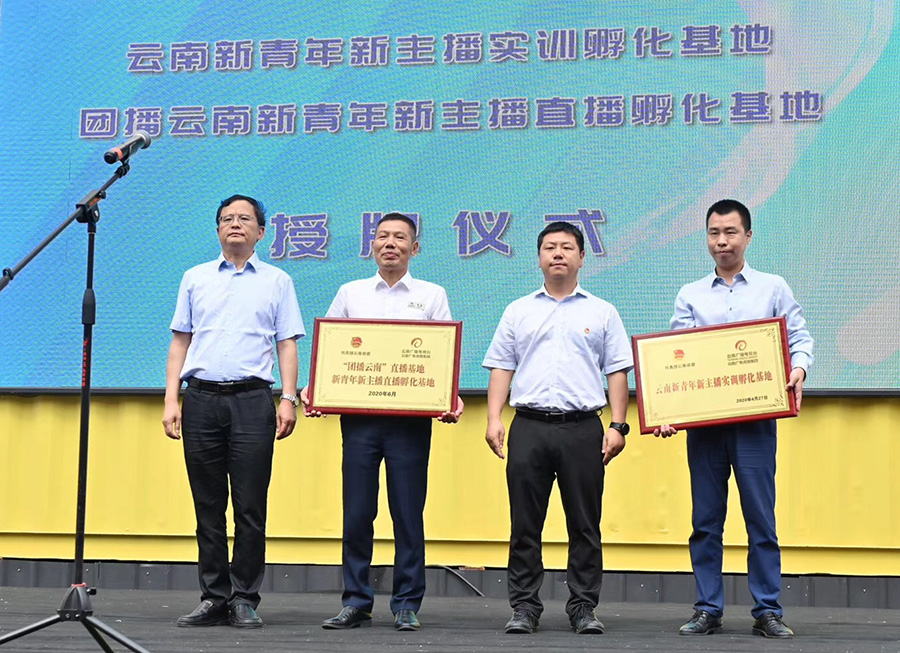 活動(dòng)現(xiàn)場(chǎng),共青團(tuán)云南省委黨組成員、副書(shū)記趙攀峰,云南廣播電視臺(tái)黨委委員、紀(jì)委書(shū)記曹渭海為云南紡織(集團(tuán))股份有限公司、云南天度投資集團(tuán)有限公司頒發(fā)了“團(tuán)播云南”直播基地、云南新青年新主播直播基地牌匾。