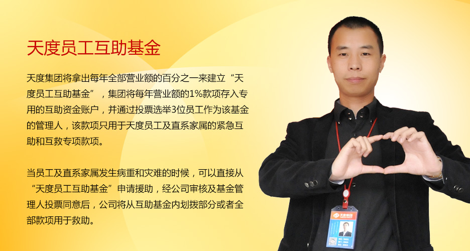 天度集團(tuán)將拿出每年?duì)I業(yè)額的百分來(lái)建立“天度員工互助基金”,集團(tuán)將每年?duì)I業(yè)額的近一成款項(xiàng)存入專用的互助資金賬戶,并通過(guò)投票選舉3位員工作為該基金的管理人,該款項(xiàng)只用于天度員工及直系家屬的緊急互助和互救專項(xiàng)款項(xiàng)。