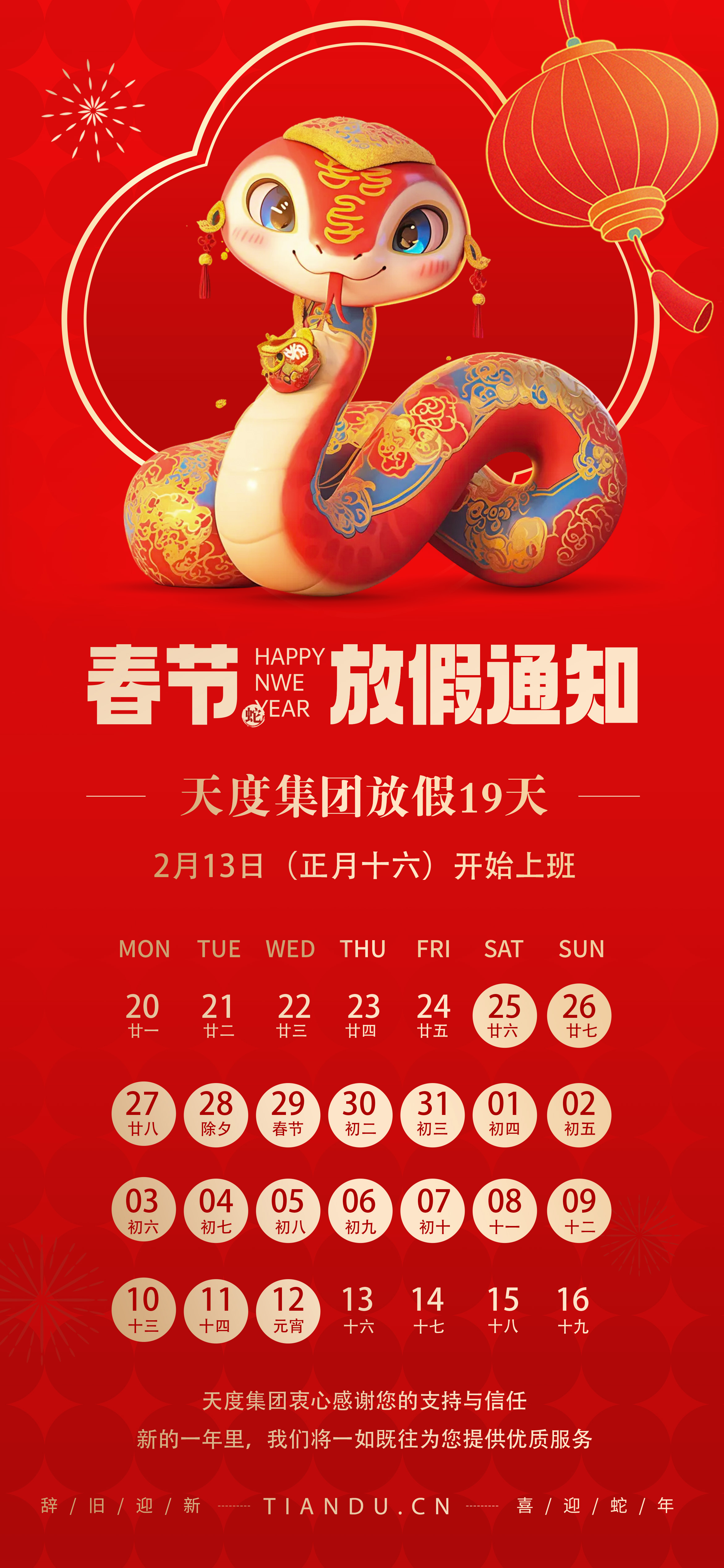 天度集團(tuán)春節(jié)放假通知(放假19天)