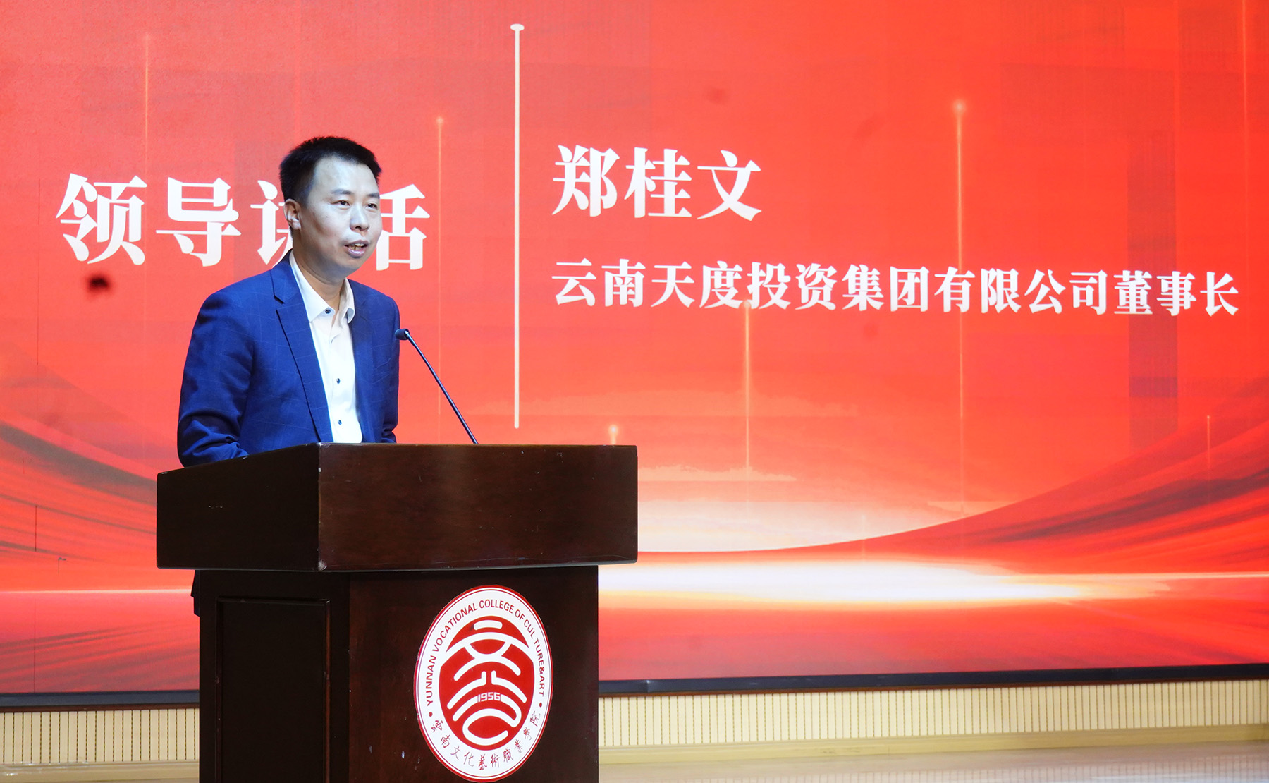 鄭桂文董事長在致辭中表示,此次合作是校企雙方貫徹落實國家職業(yè)教育改革政策、深化產(chǎn)教融合的重要舉措,也是天度集團踐行“以產(chǎn)業(yè)反哺教育、以教育賦能未來”使命的重要一步。天度集團將發(fā)揮其作為區(qū)域數(shù)字經(jīng)濟龍頭企業(yè)所擁有大數(shù)據(jù)研究院、博士后科研工作站等技術(shù)資源優(yōu)勢,以及深耕數(shù)字經(jīng)濟20年的產(chǎn)業(yè)優(yōu)勢,與學(xué)校共同聚焦融媒體技術(shù)與運營、人工智能技術(shù)應(yīng)用、軟件技術(shù)、信息安全應(yīng)用技術(shù)等相關(guān)專業(yè),通過“共建共管”模式深化產(chǎn)教融合,圍繞數(shù)字經(jīng)濟、文旅融合等重點產(chǎn)業(yè)發(fā)展需求,共同建設(shè)校內(nèi)外實訓(xùn)基地,克隆企業(yè)真實研發(fā)環(huán)境,構(gòu)建專業(yè)集群交叉矩陣,共同制定專業(yè)發(fā)展規(guī)劃,定期評估產(chǎn)業(yè)趨勢,動態(tài)優(yōu)化課程體系,保持教學(xué)內(nèi)容與產(chǎn)業(yè)發(fā)展同步,實現(xiàn)“產(chǎn)業(yè)需求進(jìn)大綱、技術(shù)標(biāo)準(zhǔn)進(jìn)課堂、真實項目進(jìn)實訓(xùn)”,合力打造精準(zhǔn)適配市場需求的特色專業(yè)集群,培養(yǎng)數(shù)字經(jīng)濟領(lǐng)域高素質(zhì)技術(shù)技能型人才,賦能區(qū)域數(shù)字經(jīng)濟、文旅融合等重點產(chǎn)業(yè)發(fā)展。鄭董事長還強調(diào)指出,希望通過此次合作,雙方將進(jìn)一步推動成立產(chǎn)業(yè)學(xué)院并使其成為云南文化藝術(shù)產(chǎn)業(yè)數(shù)字化的“創(chuàng)新引擎”,讓每一位學(xué)子在這里找到“用技術(shù)守護文化、用創(chuàng)意點亮人生”的舞臺!共同書寫產(chǎn)教融合的新篇章,為云南乃至全國的數(shù)字經(jīng)濟及文旅融合產(chǎn)業(yè)注入新的活力與動能!