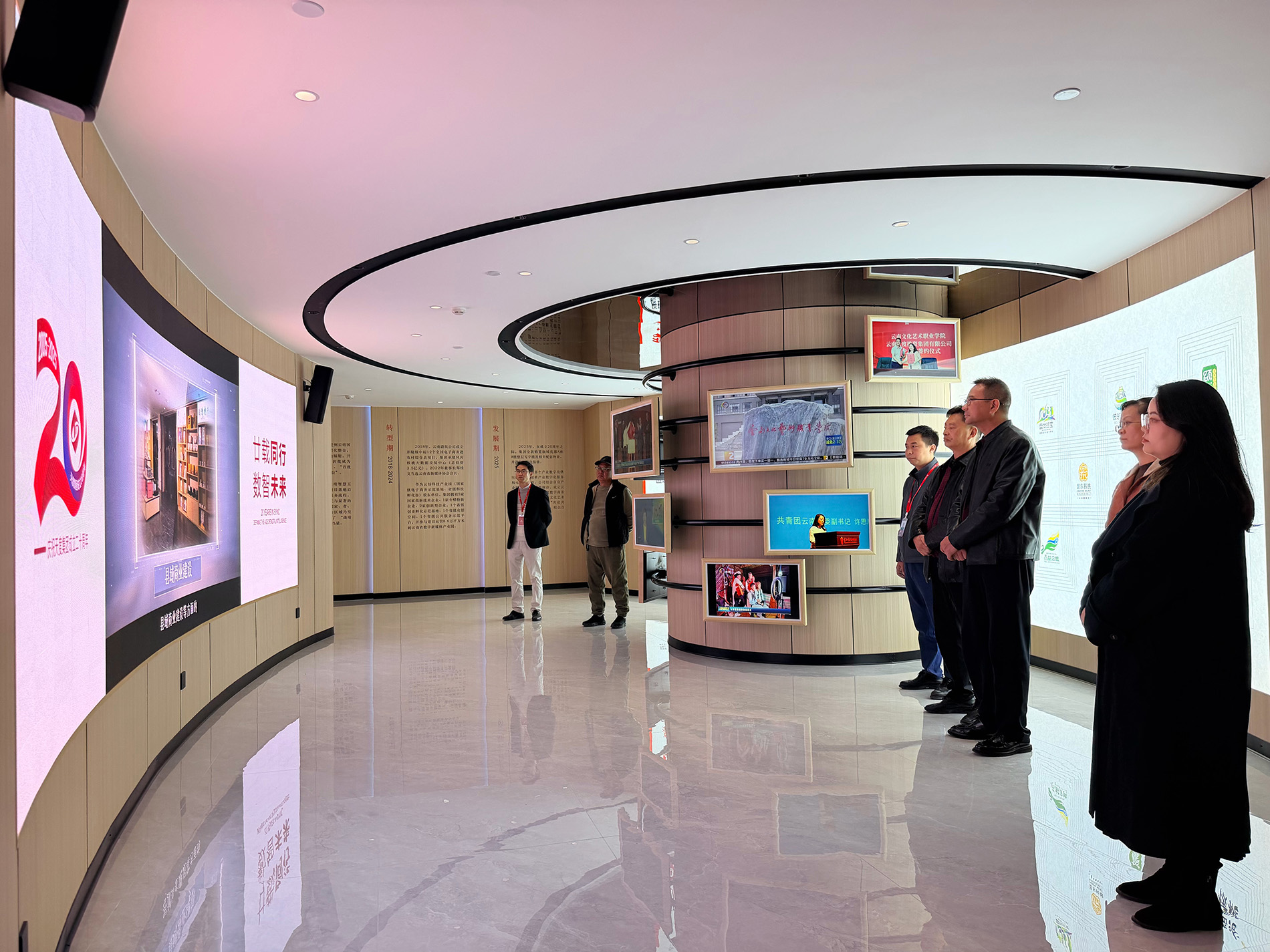 在數(shù)字化展廳,天度集團(tuán)董事長鄭桂文向儂援校長一行系統(tǒng)介紹了集團(tuán)二十年發(fā)展歷程、核心業(yè)務(wù)架構(gòu)與未來戰(zhàn)略愿景。鄭桂文董事長回顧了天度從創(chuàng)業(yè)起步到如今成為云南省產(chǎn)業(yè)數(shù)字化領(lǐng)域重要參與者的成長路徑,重點(diǎn)闡述了集團(tuán)在“聚焦數(shù)字經(jīng)濟(jì)、服務(wù)鄉(xiāng)村振興”戰(zhàn)略指引下,在人工智能技術(shù)應(yīng)用、產(chǎn)業(yè)互聯(lián)網(wǎng)平臺(tái)建設(shè)、電子商務(wù)與數(shù)字化供應(yīng)鏈、產(chǎn)教融合共建產(chǎn)業(yè)學(xué)院等板塊的探索與成果。