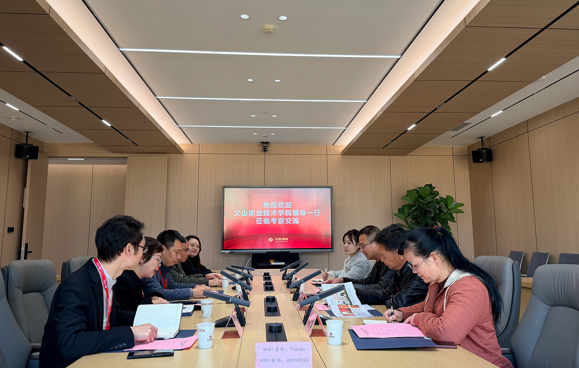 天度集團(tuán)結(jié)合自身在智能制造、人工智能應(yīng)用、數(shù)字化運(yùn)營等領(lǐng)域的發(fā)展實(shí)踐,分析了相關(guān)行業(yè)對(duì)技術(shù)技能人才的能力要求,并介紹了集團(tuán)在產(chǎn)教融合方面的現(xiàn)有模式與案例。儂援校長對(duì)天度集團(tuán)二十年取得的成就表示贊賞,并介紹了文山職業(yè)技術(shù)學(xué)院在專業(yè)建設(shè)、人才培養(yǎng)方面的特色與規(guī)劃。他表示,此次參訪旨在深化學(xué)校與省內(nèi)優(yōu)質(zhì)企業(yè)的聯(lián)系,推動(dòng)教育鏈、人才鏈與產(chǎn)業(yè)鏈、創(chuàng)新鏈的有機(jī)銜接。